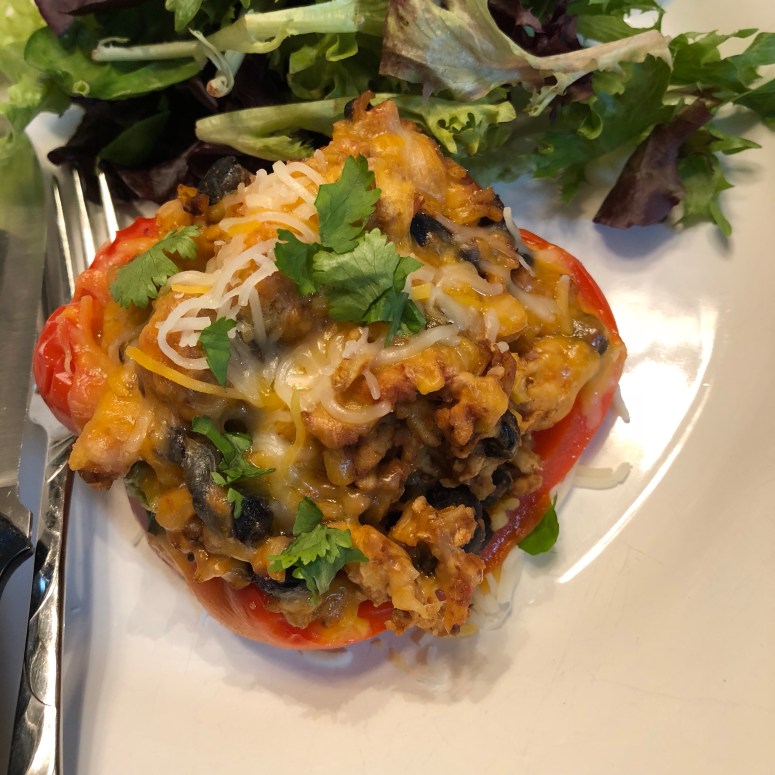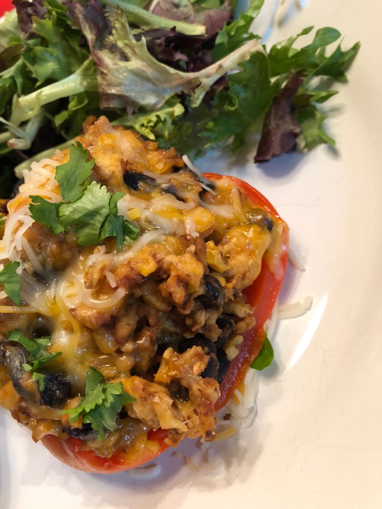 Place softened bell peppers in a 13X9 casserole dish…. this could be the same dish you already used, just drain out the water. Now fill the peppers with the turkey mixture. I like to press down gently to make sure I get all of the pepper filled. Finally I top with some shredded cheese and pop in the oven for 20 minutes.